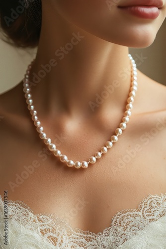 Close-up of a woman wearing a pearl necklace and lace garment, highlighting her neck and collarbone with soft natural lighting