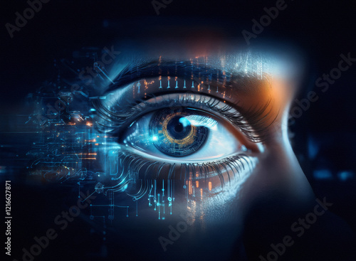 Close-up of a woman's eye, overlaid with a grainy, digital circuit pattern on a textured paper-like surface. The image evokes themes of technology and human connection.