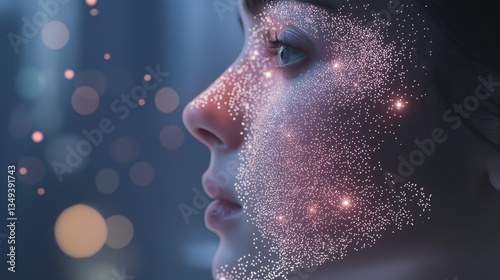 Close-up of a woman's face. the woman's eyes are closed and her expression is peaceful. the background is blurred, but it appears to be a cityscape with buildings and lights.