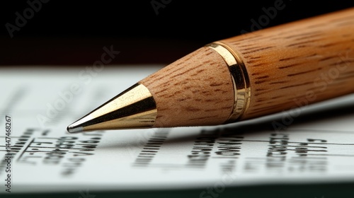 Close-up of a wooden pen poised above typed document, ready to write on a table