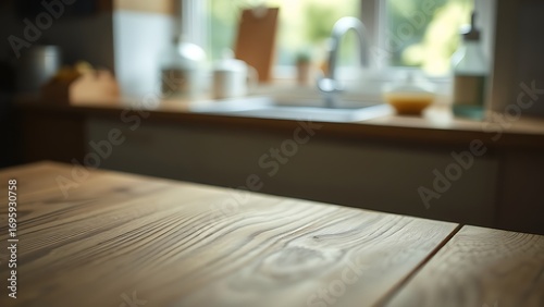 Close-up of a wooden table surface highlighting natural grain texture under soft kitchen light.