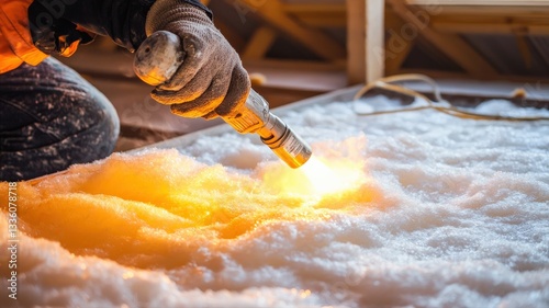 Close-up of a worker using a blow torch to seal insulation panels on a roof, demonstrating precision, safety, and skilled roofing insulation installation in residential construction.