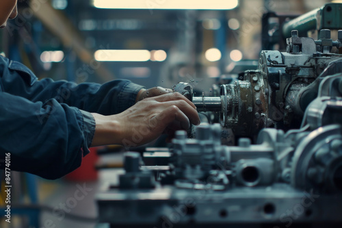 Close-up of a worker’s hands meticulously fixing machinery in a factory, highlighting the precision and skill required in industrial repair work.