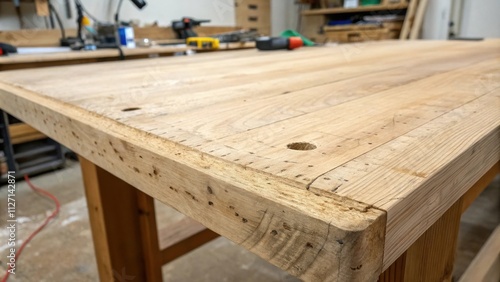 Close-up of a worn wooden workbench with a natural finish, showing the grain and texture of the wood
