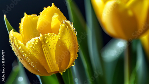 Close-up of a yellow tulip with brightly colored petals, slightly open, against a background of blurred green foliage and another tulip.
