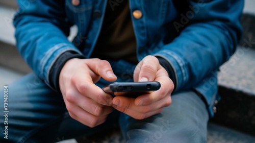 Close-up of a young man using mobile smart phone outdoors.AI.
