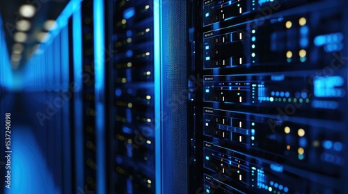Close-up of advanced server racks in a high-tech data center with glowing blue lights, symbolizing cloud computing, secure storage systems, and robust network infrastructure for digital solutions