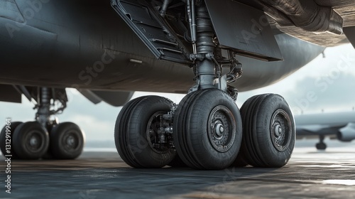 Close-up of aircraft landing gear on the tarmac, showcasing engineering and design.