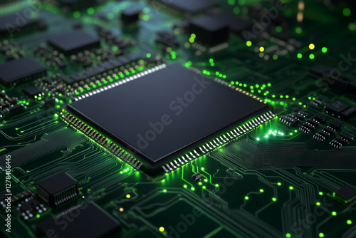 Close-up of an advanced microchip on a glowing green circuit board, symbolizing modern computing, AI, data processing, and high-tech innovation.