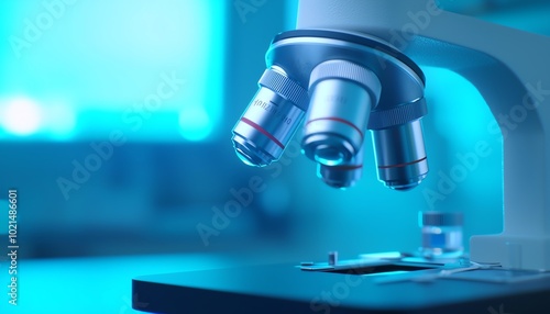 Close-up of an advanced microscope with multiple lenses, highlighting its intricate design and functionality in a lab setting.