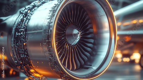 Close-up of an airplane engine, with the fan blades and core visible in detail