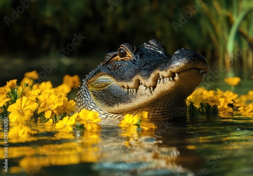 Close-Up of an Alligator Surrounded by Vibrant Yellow Flowers in a Tranquil Water Setting on a Bright Sunny Day