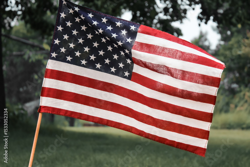Closeup of an American flag staked in a green lawn with a shallow depth of field and green tree canopy background. USA traditional holiday design element