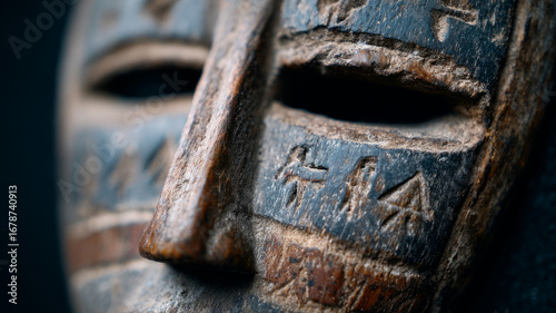 Close-up of an ancient carved tribal mask with intricate patterns.