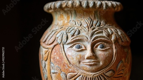 Close-up of an ancient clay vase with a carved face and floral designs.