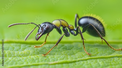 Close-up of an ant walking on a green leaf, showcasing detailed features.