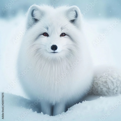 Close-up of an arctic fox with detailed white fur against a snowy background.