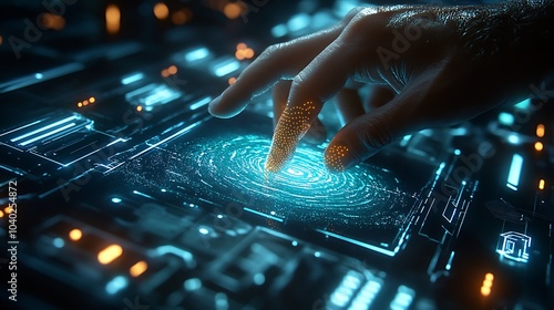 Close-up of an augmented reality fingerprint interface, glowing holographic elements floating in mid-air, person’s hand reaching to touch the fingerprint scanner, deep blue lighting, cyberpunk style,