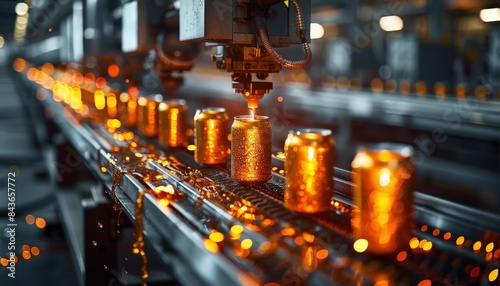 Close-up of an automated process filling beverage cans in a factory, highlighting the efficiency and precision of modern manufacturing.