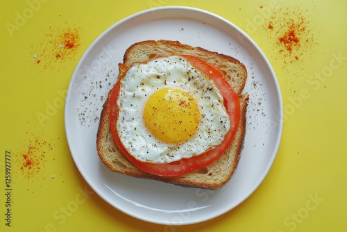 close-up of an egg and tomato on toast sandwich, placed against the edge of a white plate with some sprinkled cayenne pepper on it, all set against a vibrant yellow background.