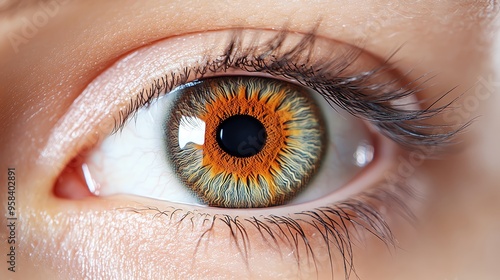 Close-up of an eye showcasing vibrant colors, highlighting intricate details of the iris and eyelashes.