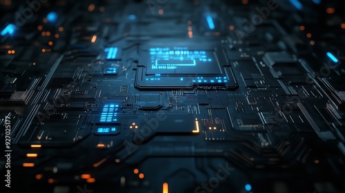 Closeup of an intricate circuit board with glowing lights, representing the complex inner proportions and patterns in technology. The vibrant colors symbolize energy and data flow through connections