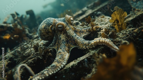 Close-up of an octopus camouflaged on a sunken ship, surrounded by seaweed.