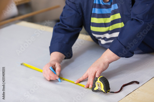 Closeup of an older woman in a furniture factory who is measuring and marking a grey material for the sofa with a chock.