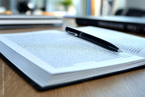 Close-up of an open book with a pen resting on the pages, suggesting reading, writing, or studying. Perfect for education, literature, or knowledge concepts.