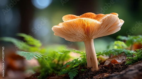 Close-up of an orange and beige mushroom cap. Lush green foliage and soft bokeh background