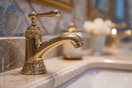 Closeup of an ornate goldplated faucet on a marble countertop in a luxurious bathroom setting