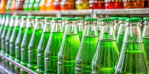 Close-up of assorted green soda bottles on display in a supermarket shelf, featuring various shapes and sizes, with labels and caps exposed , fizzy drinks, beverage bottles