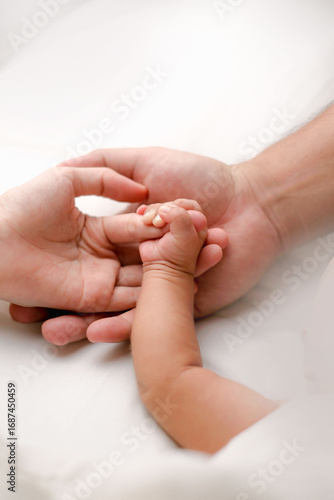 Close-up of baby feet cradled by parents’ hands on white linens. Soft, high-key image about love, protection, and infant care—perfect for family, maternity, wellness, and pediatric themes.