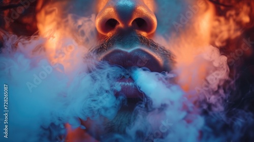 Close-Up of Bearded Man Exhaling Vapor in a Neon-Lit Setting at Night