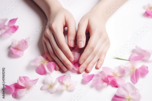 Close-up of beautiful female hands with flowers. The concept of hand care anti-aging cream and spa. AI generated