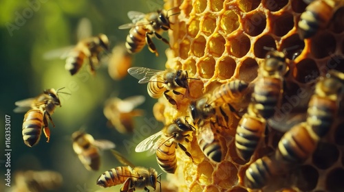 Close-up of bees working on a honeycomb in a vibrant natural setting.