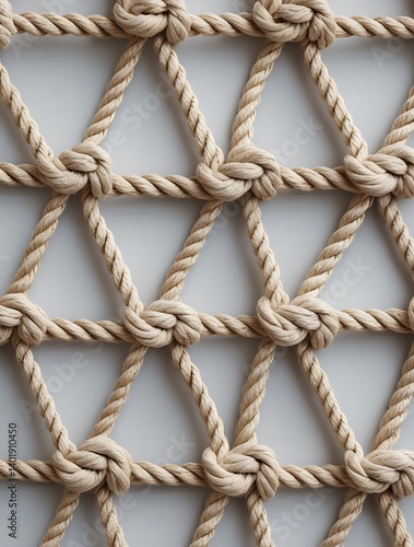 Close-up of beige rope netting, showing detailed texture and pattern of knotted ropes arranged in a diamond grid against a neutral background