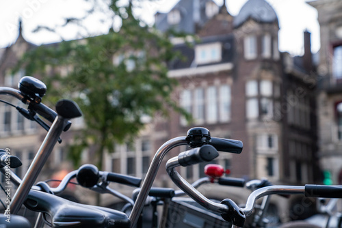 Close-up of bicycle handlebars and bells in a European city setting, with blurred historic architecture in the background, capturing the urban cycling culture and charm of European streets.