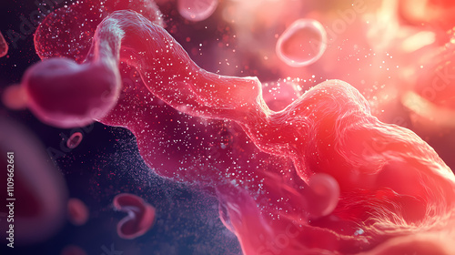 Close-up of blood cells: red cells varied, white cells defending, with soft lighting and swirling plasma. Plasma. Illustration