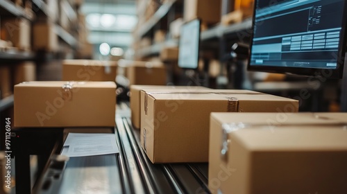 Close-Up of Boxes on Conveyor Belt in Warehouse with Blurred Office Background. AI generated illustration