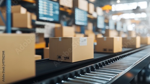 Close-Up of Boxes on Conveyor Belt in Warehouse with Blurred Office Background. AI generated illustration