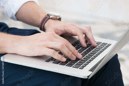 Closeup of business man working on laptop outdoors. Guy sitting with laptop computer on his lap and blurred view in background. Technology in business concept. Side view.
