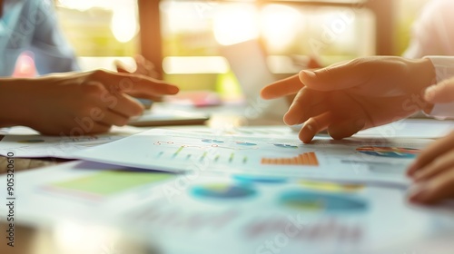 Closeup of Business Meeting Table with Documents and Graphs in Bright Daylight Office