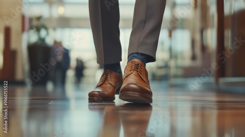 Close-up of business professional walking in a modern building. Focused on polished shoes and legs, blurred background shows other people