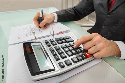Close-up Of Businessman Calculating Invoice Using Calculator