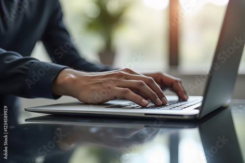 Close-up of Businessman Hands Typing on Laptop Computer Keyboard in Modern Office, Freelancer or Business Professional Working on Internet Connection Technology with Natural Light Reflection on Desk