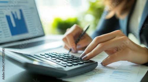 Close-up of businesswoman's hands using calculator and pen on financial documents.