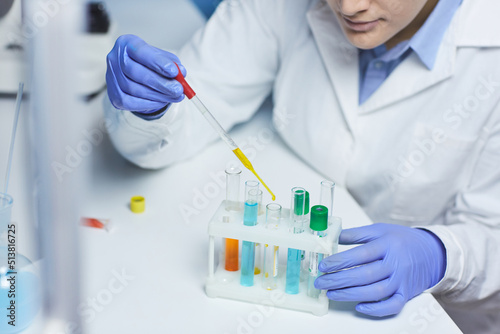 Close-up of busy female chemist in blue rubber gloves sitting at desk in laboratory