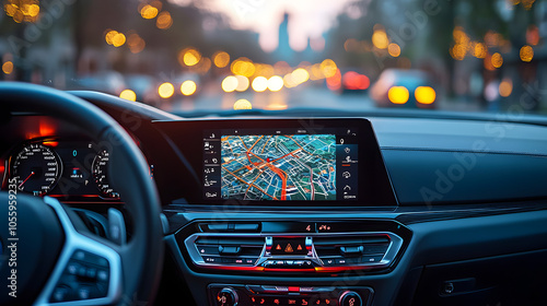 close-up of car dashboard featuring GPS navigation, with evening city lights and blurred traffic outside, evoking ambiance of an urban drive at twilight. car dashboard featuring GPS navigation