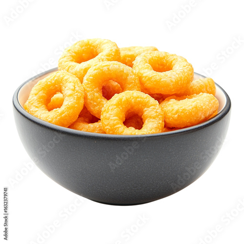 Closeup of cheesy cheese puffs in a bowl, isolated on a isolated on transparent background